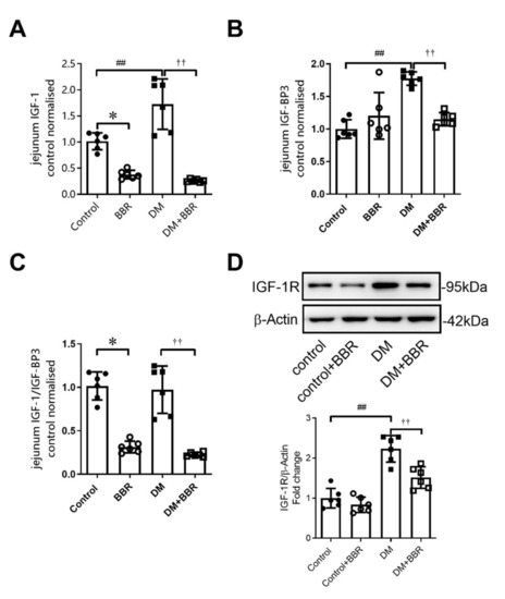 Berberine treatment (200 mg·kg−1·day−1, BW) for 6 weeks decreased intestinal IGF-1, IGFBP-3 levels, and IGF-1R expression in diabetic mice. (A–C) Intestinal IGF-1, IGFBP-3, and IGF-1/IGFBP-3 were decreased in diabetic mice after berberine treatment (200 mg·kg−1·day−1, BW) for 6 weeks. (D) Intestinal IGF-1R expression were decreased in diabetic mice after berberine treatment (200 mg·kg−1·day−1, BW) for 6 weeks. Data are expressed as mean ± SEM (n = 6). Control, control mice; Control + BBR, control mice treated with berberine (200 mg·kg−1·day−1 gavage), DM, diabetic mice; DM + BBR, diabetic mice treated with berberine (200 mg·kg−1·day−1 gavage). Control vs. Control + BBR, * p < 0.05; Control vs. DM, ## p < 0.01; DM vs. DM + BBR, †† p < 0.01.