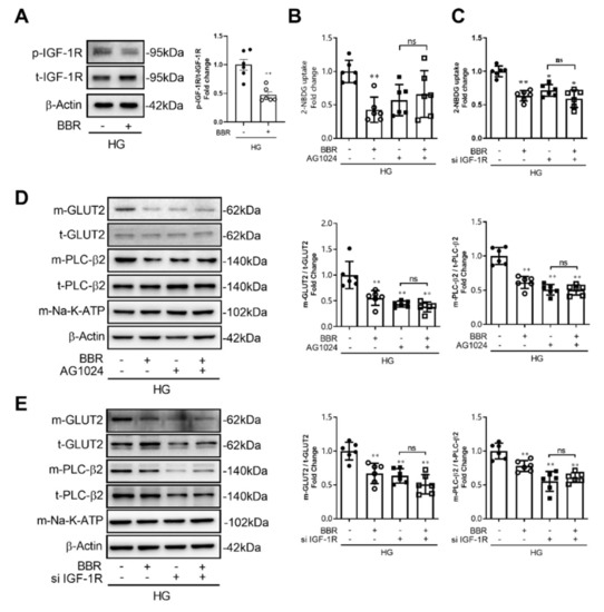 Berberine decreased GLUT2 translocation and glucose uptake through inhibiting the IGF-1R-PLC-β2-GLUT2 signal pathway. (A) Berberine decreased phosphorylation of IGF-1R in IEC-6 cells. (B,C) AG1024 (10 μM) and siRNA for IGF-1R blocked berberine’s effects on 2-NBDG uptake in IEC-6 cells. (D,E) AG1024 (10 μM) and siRNA for IGF-1R blocked berberine’s effects on GLUT2 translocation and PLC-β2 membrane localization in IEC-6 cells. Data are expressed as mean ± SEM (n = 6). HG, high concentration of glucose (50 mM); m-GLUT2, membrane localized GLUT2; t-GLUT2, total GLUT2; m-PLC-β2, membrane localized PLC-β2; t- PLC-β2, total PLC-β2; p-IGF-1R, phosphorylation of IGF-1R; t-IGF-1R, total IGF-1R. AG1024, IGF-1R inhibitor. si IGF-1R, siRNA for IGF-1R. * p < 0.05, ** p < 0.01, vs. control; ns, no significance.