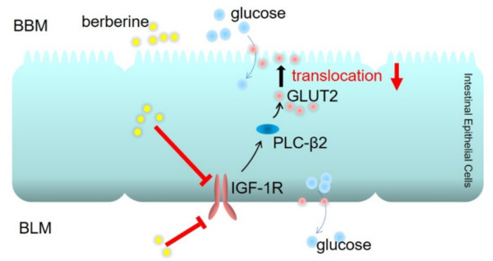 This study aims to determine the effects of berberine on the intestinal glucose absorption and postprandial hyperglycemia in T2DM. We found that berberine decreased GLUT2 localization in the BBM of intestinal epithelium through suppressingIGF-1R-PLC-β2-GLUT2 signaling.