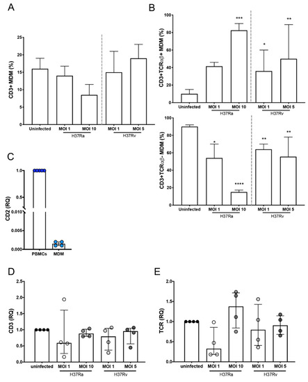Expression of TCR is increased on the surface of CD3+ monocyte-derived macrophages (MDMs) infected with the Mycobacterium tuberculosis (Mtb) H37Rv virulent strain. Human MDMs were obtained after 7 days in culture; 2 × 106 MDMs (per condition) were infected, and at 24 h post-infection, they were recovered. (A) Frequency of CD3+ MDMs among macrophages infected with H37Ra (MOI = 1 and 10) and H37Rv (MOI = 1 and 5) Mtb strains; and (B) frequency of CD3+TCRαβ+ and CD3+TCRαβ− subpopulations. The relative expression of CD2 (C), CD3 (D), and TCR (E) genes in Mtb-infected MDMs was assessed by real-time qPCR, and the gene expression was calculated relative to that in the uninfected MDMs for each experimental replicate (RQ = 1). Bar graphs in A and B show median values and interquartile ranges (IQRs, 10–90) from four independent experiments; scatter plots with bar in C, D, and E show median values and IQRs from four independent experiments. Statistical analysis was performed with the Kruskal–Wallis test followed by Dunn’s post-test to compare infected versus uninfected MDMs. * p < 0.05, ** p < 0.01, *** p < 0.001, **** p < 0.0001.