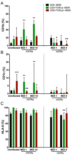 The Mtb virulent strain differentially modified the expression of the antigen-presenting molecules. The frequency of CD3+TCRαβ−CD1b+ and CD3+TCRαβ−CD1c+ MDMs was increased upon infection with the H37Ra strain (at both MOIs) compared with the frequency of CD3− MDMs (asterisks). In contrast, only the CD3+TCRαβ+CD1c+ MDM frequency was affected, as compared with the frequency of the same subpopulation under the uninfected condition (dots; Figure 2A,B, left). However, infection with the H37Ra strain did not affect HLA-II expression on the MDM subpopulations (Figure 2C, left).