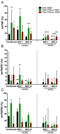 The participation of the TNF pathway in CD3+ myeloid cells has been reported in different models of mycobacterial infection [5,7,8]. The expression of tmTNF, tmTNFR1, and tmTNFR2 inside the gate of CD3−, CD3+TCRαβ+, and CD3+TCRαβ− MDMs was evaluated by flow cytometry (Supplementary Figure S2). Compared with the frequency of CD3− MDMs, H37Ra increased (asterisks) the frequency of CD3+TCRαβ−tmTNF+ MDMs at an MOI of 1 and of both CD3+TCRαβ−tmTNF+ and CD3+TCRαβ+tmTNF+ MDMs at an MOI of 10; here, it is important to note that, in the uninfected condition, the frequency of CD3+TCRαβ−tmTNF+ and CD3+TCRαβ+tmTNF+ MDMs was higher than that of CD3− MDMs (Figure 3A, left). Regarding the expression of TNFRs, H37Ra at an MOI of 1 increased the frequency of CD3+TCRαβ−tmTNFR1+ and CD3+TCRαβ+tmTNFR1+ MDMs compared with that of CD3-tmTNFR1+ MDMs (asterisks). Interestingly, when the CD3−tmTNFR1+ MDM frequency generated during the H37Ra infection was compared with that in the uninfected condition, the subpopulation frequency was decreased (dots; Figure 3B, left), and the expression of tmTNFR2 was not affected by infection with H37Ra and H37Rv (Figure 3C).