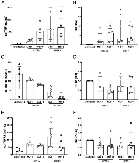 We hypothesized that MDMs produce high levels of TNF; however, during the virulent Mtb strain infection, it sheds from the cell surface, and consequently, the tmTNF levels are decreased, whereas those of solTNF are increased. To confirm our hypothesis, we evaluated the expression of TNF, TNFR1, and TNFR2 at the transcript level in MDM infected with H37Ra and H37Rv. Our data confirmed that H37Ra infection increased the expression of TNF at the transcription level, but only at the higher MOI, whereas H37Rv did so at an MOI of 1 (Figure 4B). Furthermore, despite the changes observed in the transmembrane and soluble forms of TNFRs, we did not observe any change in the transcript levels of TNFR1 or TNFR2 (Figure 4D and F, respectively).