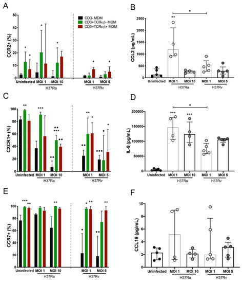 Compared to that of CD3− MDMs, H37Ra (MOI 1) increased the frequency of CD3+TCRαβ−CCR2+ MDMs, as well as their ligand, CCL2 (Figure 5A,B, left, respectively), whereas H37Rv infection (at both MOIs) induced an increase in the frequency of CD3+TCRαβ+CCR2+ MDMs compared with that of CD3− MDMs (asterisk), and the CCL2 levels were similar (Figure 5A,B, right, respectively), although they were lower than those with H37Ra infection. Compared with that of CD3− MDMs, the frequency of CD3+TCRαβ−CXCR1+ and CD3+TCRαβ+CXCR1+ MDMs was increased in both strains. However, the frequency of CD3− MDMs decreased compared to that in the uninfected condition (dots; Figure 5C). Regarding levels of IL-8, the ligand of CXCR1, we observed that H37Ra and H37Rv induced the production of IL-8, but the H37Ra strain induced higher production than H37Rv (Figure 5D). Furthermore, H37Rv affected the frequency of CD3−CCR7+ MDMs compared with that in the uninfected condition (dots). In contrast, the frequencies of CD3+TCRαβ−CCR7+ and CD3+TCRαβ+CCR7+ MDMs were higher than that of CD3−CCR7+ MDMs (asterisks; Figure 5E), and CCL19 levels (ligand to CCR7) were not modified as a result of H37Ra and H37Rv infection (Figure 5F). Together, these data show that the virulence of Mtb affects the expression of chemokine receptors, as well as CCL2 and IL-8, negatively, suggesting that CD3+ MDM subpopulations have altered migration ability.