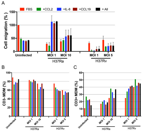 To assess the migration ability of the novel CD3+ MDM subpopulation, we evaluated the migration of MDM cells, infected with H37Ra and H37Rv (24 h), in response to the chemokines CCL2, IL-8, and CCL19. MDMs infected with H37Ra (MOI = 1) exhibited a high ability to migrate in response to IL-8, CCL19, and a combination of the three chemokines. However, these MDMs lost their capacity to respond to CCL2. H37Ra (MOI = 10) decreased the migration ability by approximately 50% compared with that in uninfected MDMs, and these cells did not respond to either the chemokine or positive control stimuli (Figure 6A, middle). In contrast, the H37Rv strain negatively affected the migration ability of MDMs even at an MOI of 1, with these cells losing approximately 80% of their migration ability in response to the chemokine and positive control stimuli (Figure 6A, right).