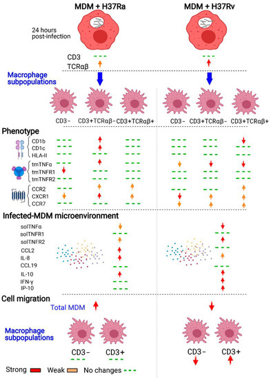 A better understanding of this process would be relevant, considering CD3+ macrophage subpopulations can participate in the regulation of the local proinflammatory response and therefore, in the control of infection. In this study, we evaluated the role of Mtb virulence in the generation of human CD3+TCRαβ+ and CD3+TCRαβ− monocyte-derived macrophages (MDMs). First, we infected MDMs in vitro for 24 h with two Mtb strains, avirulent H37Ra and virulent H37Rv. Then, we performed a phenotypical characterization of the cells of the subpopulations, specifically CD3− (classical macrophages) cells and CD3+TCRαβ+ and CD3+TCRαβ− MDMs. Finally, we evaluated their ability to migrate in response to the chemokines CCL2, IL-8, and CCL19.