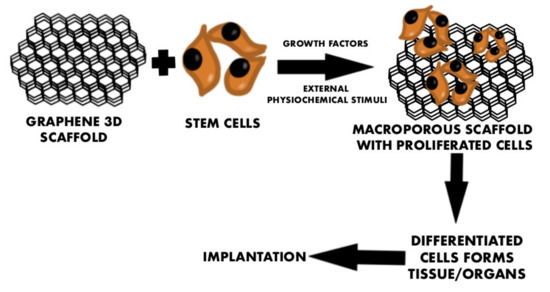 The dogma of neural science claims that components of neural systems have poor regenerating capacity in terms of reestablishing axonal connections after injury or diseases. Decades of tissue engineering research have changed this so far highly polarized view and created new perspectives showing potential solutions. The application of the tissue engineering paradigm involving cell transplantation and the design of biomaterials replacing native ECM proved that successfully regenerating neural systems is only a matter of time. In order to achieve this ambitious goal, different scaffolds are currently being evaluated for supporting neural tissue regeneration, by offering unique spatial configurations, superior adhesive profiles, or predictable guiding capacity [1]. In terms of restoring neuronal signaling, the biomaterials’ physical properties, such as electrical conductivity, are of the utmost importance, as well as the spatial biomaterial configuration. Over the last several years, graphene has attracted much attention. It is understandable because it brings with it an infinite number of possibilities for use in the world of medicine, engineering, electronics, and even more industries [2]. Even though graphite, which consists of many layers of graphene, surrounds us on a daily basis, the graphene itself was isolated for the first time in 2004 by mechanical exfoliation using the “scotch-tape” method [3]. This approach allowed the creation of 2D graphene flakes and the first physical characterization of this material. In every aspect, graphene revealed unique features: it is the thinnest of all known materials—only one atom thick, it is the strongest material ever measured—the in-plane carbon bond is stronger than the tetrahedral carbon bond in a diamond. At the same time, it is flexible and stretchable, and can be fully bent and stretched up to 20%. It has the highest thermal conductivity of all materials [4]. All of the above-mentioned properties allow this material to be advantageous for biomedical applications. Although carbon derivatives are often used in biotechnology, graphene is still in the early translational research phase, and its potential is being gradually uncovered [5]. The major strategy so far, to use graphene in tissue engineering, is concentrating on suspending graphene in culture media or applying it as a scaffold for cell culturing. These first attempts are slowly evolving into a new stage of graphene research, focusing on utilizing graphene’s conductivity profile to create signaling cellular interfaces. Scaffolds containing graphene-based nanomaterials (GBNs) can induce neuronal differentiation due to porosity or wrinkles. Additionally, GBNs used as electrodes combined with scaffolds can efficiently induce neuronal differentiation by electrical stimulation. This possibility opens up the prospect of transforming low differentiated cells of the patient into specialized cells that will allow the regeneration of damaged structures of CNS or PNS. Tissue engineering is still developing technology to produce “off-the-shelf organs” for patients in need of transplantation (Figure 1). One of the crucial problems to be solved is to obtain non-toxic, biocompatible material [6,7] that supports differentiation into neural cells to replace intramural neuronal networks. The major limitation of current tissue engineering technology is the impaired function of regenerated organs due to insufficient reconstruction of the neuronal component. Tissue engineering of the nervous system involves regeneration of damaged connections and nerve cells, the creation of functional neuronal networks, and targeted drug delivery. In addition, graphene, due to its unique properties of thinness and conductivity, is enabling the next generation of biotechnology aimed at developing customized scaffolds for neural-machine interfaces or neuroprosthetic devices. Current treatment of injured peripheral nerves is based on surgical reconstruction aimed at joining two nerve endings. Performing mechanical anastomosis, often using autografting, does not restore full functionality. It entails also a number of limitations, including, among others, the fact that the nerve gap cannot be longer than 4 cm, and that still does not always allow 100% restoration of the pre-injury functionality [8]. Damage to the CNS often causes more serious consequences and, hence, is more difficult to repair due to the complicated structure involving the conventional neuronal network and uncontrolled formation of glial scars. To solve the problem of the lack of a support for brain tissue regeneration, it is crucial to develop a biomaterial that will not only be a site for cell adhesion, but also provide the best conditions for cell proliferation and differentiation [9]. The aim of this study was to assess and review the properties, advantages, and limitations of graphene used in tissue engineering of the nervous system.