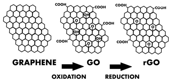 Diagram showing the structure of graphene, GO, and rGO.