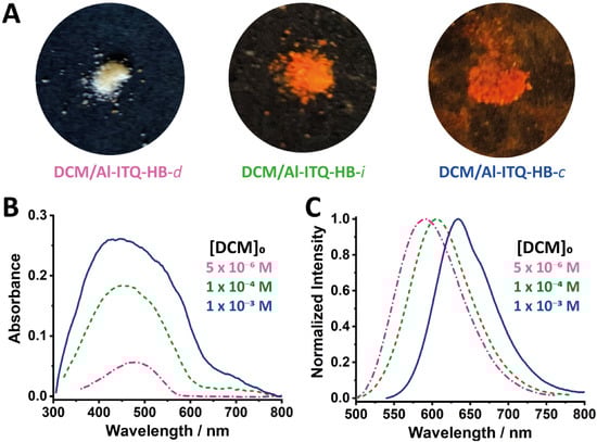 Three DCM/Al-ITQ-HB composites of different loadings were prepared using different concentrations of DCM dye: 5 × 10−6, 1 × 10−4, and 1 × 10−3 M. Considering the synthetic procedure of these hybrid composites (see Section 3) where the solvent is evaporated and the final hybrid composite sample is not washed, we can envisage that most of DCM molecules will be adsorbed on the MOF’s surface. Indeed, it has been described that a proper washing is necessary for removing the molecules adhered to the MOFs‘ surface, meaning that when the hybrid material is not properly washed, most of the molecules will be attached onto the MOF’s surface [,,]. The colour of the obtained samples (DCM/Al-ITQ-HB-d, d = diluted; DCM/Al-ITQ-HB-i, i = intermediate; DCM/Al-ITQ-HB-c, c = concentrated) varies from light to vibrant orange when the initial dye concentration increases (Figure 1A). The absorption spectra of the investigated samples (obtained through the diffuse reflectance measurements) are shown in Figure 1B, while their emission ones are displayed in Figure 1C. Moreover, the spectra in Figure 1B have been corrected by subtracting the absorption of Al-ITQ-HB. Figure S1A shows the non-corrected spectra together with that of pristine Al-ITQ-HB, while Figure S1B exhibits the corrected, normalized ones of the composites compared with the spectrum of DCM in dichloromethane.