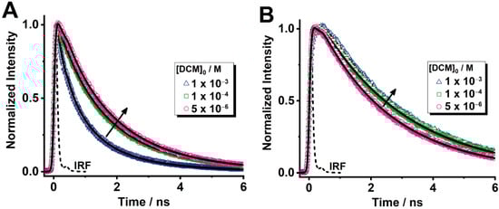 Normalized (to the maximum intensity) magic-angle emission decays of DCM/Al-ITQ-HB at different initial dye concentrations: 1 × 10−3 M (blue triangles), 1 × 10−4 M (green squares), and 5 × 10−6 M (pink circles) upon excitation at 470 nm and observing at 550–575 (A) and 700–750 (B) nm. The solid lines are from the best-fit using a multi-exponential function. IRF (black dashed line) is the instrumental response function.