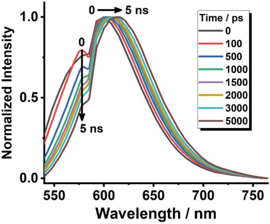 Normalized (to the maximum intensity) TRES of DCM/Al-ITQ-HB using initial dye concentration of 1 × 10−3 M upon excitation at 470 nm and gating at the indicated delay times.