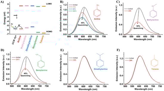 (A) Schematic representation of the HOMO-LUMO energy levels (in gas phase) for the DCM dye and the aromatic compounds used for the quenching test (aniline, methylaniline, dimethylaniline, benzylamine, and toluene). (B–F) Emission spectra of DCM/Al-ITQ-HB ([DCM]0 = 1 × 10−4 M) in the absence and presence of aniline (B), methylaniline (C), benzylamine (D), dimethylaniline (E), and toluene (F) atmospheres. For (B–D) the percentage of emission quenching is displayed in the figure.