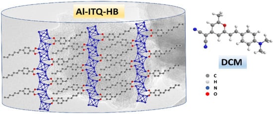 DCM was adsorbed on the MOF’s surface using the following method. First, a solution of DCM with a known concentration (5 × 10−6, 1 × 10−4, or 1 × 10−3 M) in dichloromethane was prepared. Subsequently, 1 or 2 mL of the DCM/dichloromethane solution were added to 50 or 100 mg of MOF and the mixture was stirred for 24 h at room temperature. Finally, the excess of solvent was eliminated by evaporation. The resulting deep orange composite, DCM/Al-ITQ-HB, resulted in DCM molecules mostly adsorbed on the MOF’s surface.