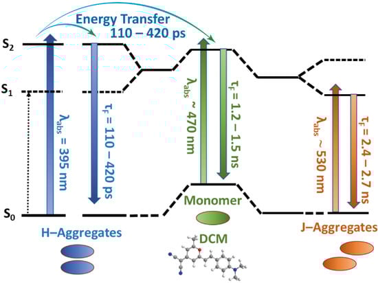 Illustration (not in scale) of the energetic levels of DCM monomers, H- and J-aggregates. The dotted arrow corresponds to a forbidden transition, while the filled ones reflect the absorption and emission transitions together with the corresponding wavelengths and lifetimes. The scheme also illustrates the EnT happening between H-aggregates and from H-aggregates to monomers.