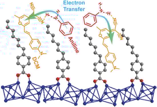 The detection of chemical compounds in the vapor phase has attracted much attention owing to the potential applicability of vapochromic sensors in the monitoring of the air quality in industrial or domestic environments, or the detection and control of medical conditions, such as diabetes [,,]. Special attention has been paid to the detection of harmful gases commonly employed in industrial processes, where a continuous tracking is needed to guarantee a healthy work environment. One interesting example is the aniline (AN) and its derivatives: methylaniline (MAN), dimethylaniline (DMA) or benzylamine (BAM); which are toxic compounds employed in several industrial processes, like the production of dyes and textile, rubber assistants, raw material for pesticides, etc. Consequently, there exist a necessity to detect these compounds in the vapor phase to prevent their exposure to the human being.
