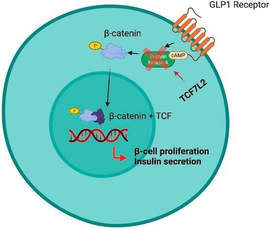 Influence of SNPs in the TCF7L2 gene in response to treatment with SU derivatives, GLP1-RA and DPP-4 inhibitors. In the pancreatic β-cell, GLP-1 phosphorylates β-catenin via cAMP-dependent protein kinase A (PKA). This avoids the degradation of the β-catenin that subsequently accumulates, enters the nucleus and forms the transcription factors β-catenin/TCF. This leads to activation of genes such as Isl-1 and Axin2. Overall, this pathway results in pro-insulin processing, β-cell protection from IL-1β and interferon-γ-mediated apoptosis, stimulation of β-cell proliferation and glucose/GLP-1-stimulated insulin secretion. Patients with TCF7L2 gene variants have impaired TCF7L2 expression in pancreatic β-cells resulting in reduced insulin secretion and impaired response to incretins (GLP1-RA, DDP-4 inhibitors). The abnormal response to GLP1-RA and DPP-4 inhibitors is likely to depend on the direct effect of TCF7L2 on PKA.