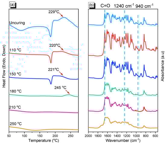 (a) DSC and (b) in situ FTIR spectral analyses of the uncured PA-BZ and the PA-BZ thermally polymerized at various curing temperatures to form poly(PA-BZ).