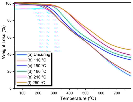 TGA analyses of the uncured PA-BZ and the PA-BZ cured at various temperatures.