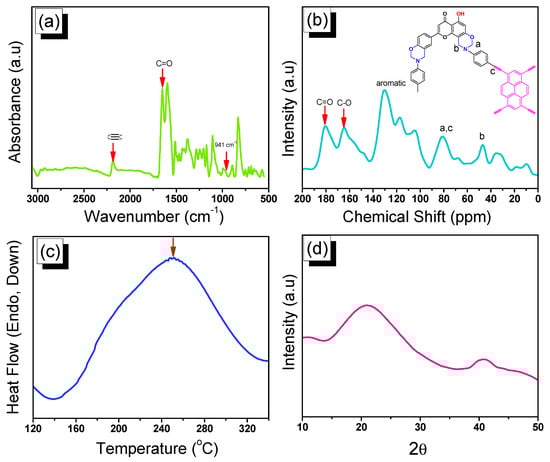 (a) FTIR spectrum, (b) solid state 13C CP/MAS NMR spectrum, (c) DSC trace, and (d) XRD profile of PA-BZ POP, recorded at room temperature.
