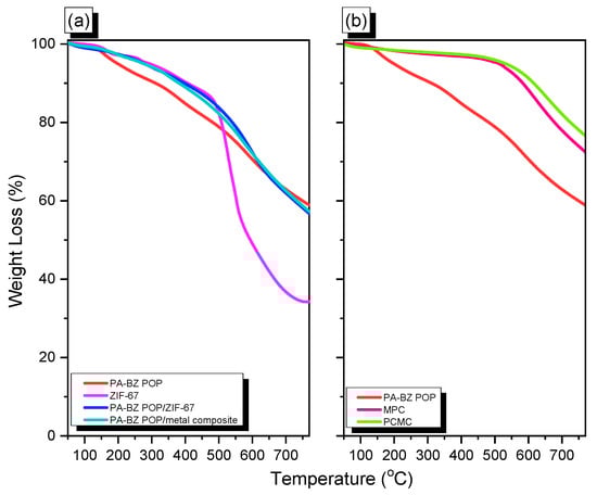 TGA profiles of the (a) PA-BZ POP, ZIF-67, PA-BZ POP/ZIF-67, and PA-BZ POP/metal composite and (b) PA-BZ POP, MPC, and PCMC.