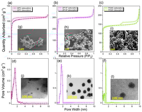 (a–c) N2 adsorption/desorption isotherms of (a) MPC, (b) ZIF-67, and (c) PCMC. Pore size distribution of (d) MPC, (e) ZIF-76, and (f) PCMC. (g–i) SEM and (j–l) TEM images of (g,j) MCP, (h,k) ZIF-67, and (i,l) PCMC.