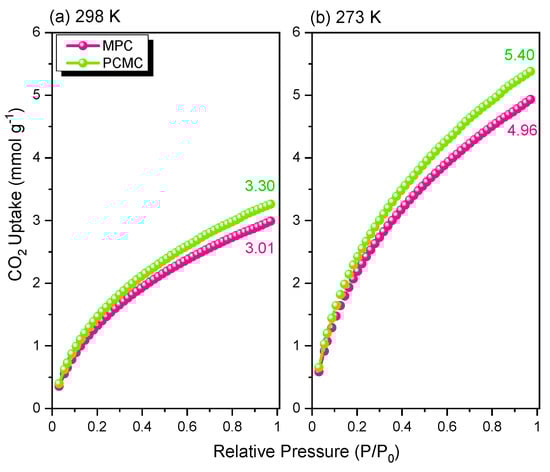 CO2 adsorption profiles of MPC and PCMC, recorded at (a) 298 and (b) 273 K.