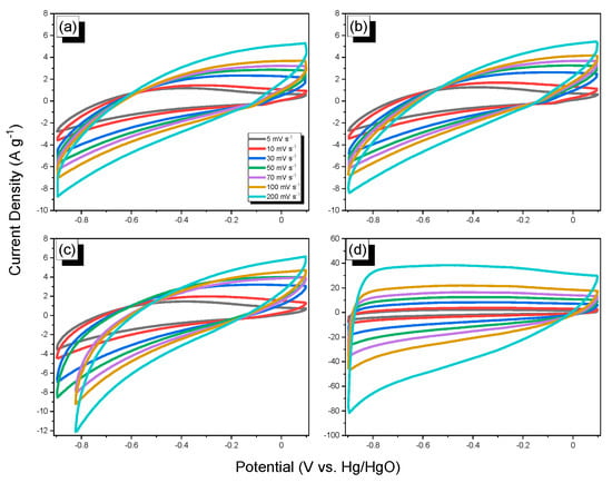We examined the electrochemical performance of our samples through cyclic voltammetry (CV) and galvanostatic charge/discharge (GCD) measurements in a three-electrode system in 1 M aqueous KOH. Figure 9a–d display the CV curves of our samples, recorded at various sweep rates from 5 to 200 mV s–1 in the potential window from 0.10 to 0.90 V (vs. Hg/HgO). The CV curves of all samples were rectangular in shape, even when recorded at the highest scan rate of 200 mV s–1, implying that the capacitive response originated mainly from EDLC, with minor pseudocapacitance. The pseudocapacitance arose from the presence of various types of oxygen and nitrogen species. The integrated area of the PA-BZ POP sample was higher than those of the other samples, revealing its superior electrochemical performance. Furthermore, the current density increased upon increasing the sweep rate, while retaining the shapes of these CV curves, suggestion facile kinetics and good rate capability [,,].