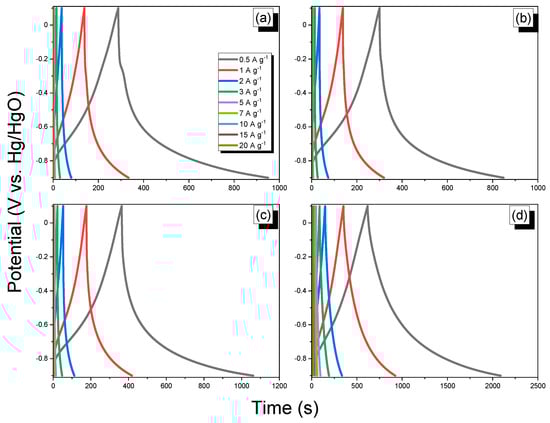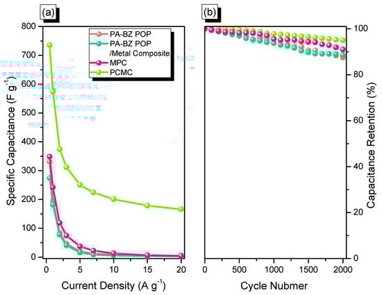 Figure 10a–d present the GCD curves of our samples, determined at various current densities. The GCD curves of all of the samples were triangular in shape, with only a slight bend, indicating both EDLC and pseudocapacitive characteristics [,]. After calcination at 500 °C, the discharging times of both the MPC and PCMC samples were longer than those of the PA-BZ POP and PA-BZ POP/metal composite (Figure 10a–d), indicating that calcination had an enhancement effect on the capacitance of our MPC and PCMC.