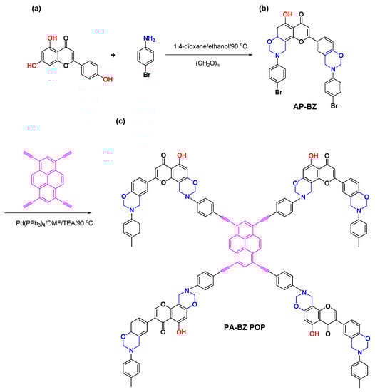 Synthesis of (b) AP-BZ and (c) PA-BZ POP precursors from (a) apigenin.