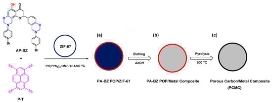 Synthesis of (a) PA-BZ POP/ZIF-67, (b) PA-BZ POP/Metal Composite and (c) PCMC through Sonogashira coupling reaction, etching and pyrolysis process.