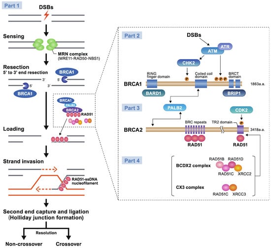 - Moynahan, M.E.; Jasin, M. Mitotic homologous recombination maintains genomic stability and suppresses tumorigenesis. Nat. Rev. Mol. Cell Biol. 2010, 11, 196–207. [Google Scholar] [CrossRef]