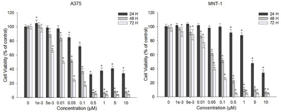 Effect of DOX on cell viability of A375 and MNT-1 cells. Cells were exposed to different concentrations of DOX for 24, 48, and 72 h, and cell viability was determined using MTT assay. Data shown are mean values ± standard deviation of three independent experiments with four technical replicates each. *—indicates statistical significance in comparison to the respective control (p < 0.05).