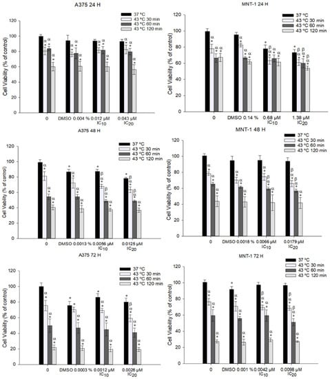 Effect of hyperthermia plus DOX on cell viability of A375 and MNT-1 cells. Cells were exposed to 43 °C for 30, 60, or 120 min, plus 0.012 μM or 0.043 μM and 0.68 μM or 1.38 μM during 24 h; 0.0056 μM or 0.0125 μM and 0.0066 μM or 0.0179 μM during 48 h; and 0.0012 μM or 0.0026 μM and 0.0042 μM or 0.0098 μM during 72 h; in cases of A375 or MNT-1, respectively. DMSO concentrations correspond to the equivalent percentage present in IC20 of each cell line and time exposure. DOX concentrations correspond to the calculated IC10 and IC20 for each time exposure and for each cell line. Cell viability was determined using MTT assay. Data are shown as mean ± standard deviation of two independent experiments with four technical replicates each. *—indicates statistical significance in comparison to the control 37 °C; α indicates statistical significance in comparison to the respective control of each condition at 37 °C; and β indicates statistical significance of the combined treatment in comparison to hyperthermia alone (p < 0.05).