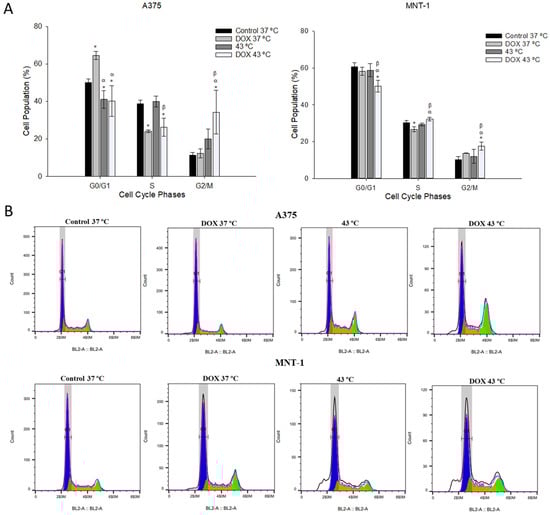 Effects of hyperthermia combined with DOX on cell cycle distribution. Cells were exposed to 43 °C for 30 min and 0.0125 μM or 0.0179 μM of DOX, in case of A375 or MNT-1 cells, respectively. (A) Cell cycle distribution (%) in A375 and MNT-1 cells; (B) histograms representative of cell distribution of A375 and MNT-1 cells. Data shown are mean values ± standard deviation of two independent experiments with two technical replicates each and each replicate with at least 5000 events. *—indicates statistical significance in comparison to the control 37 °C; α indicates statistical significance in comparison to the respective control of each condition at 37 °C; and β indicates statistical significance of the combined treatment in comparison to hyperthermia alone (p < 0.05).