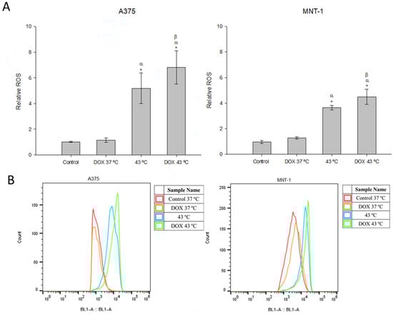 Effects of hyperthermia combined with DOX on production of intracellular ROS. Cells were exposed to 43 °C for 30 min and 0.0125 μM or 0.0179 μM of DOX for 48 h, in case of A375 or MNT-1 cells, respectively. (A) Relative abundance of intracellular ROS of A375 and MNT-1 cells; (B) histograms representative of abundance of intracellular ROS of A375 and MNT-1 cells. Data shown are mean values ± standard deviation of two independent experiments with two technical replicates each and each replicate with at least 5000 events. *—indicates statistical significance in comparison to the control 37 °C; α indicates statistical significance in comparison to the respective control of each condition at 37 °C; and β indicates statistical significance of the combined treatment in comparison to hyperthermia alone (p < 0.05).