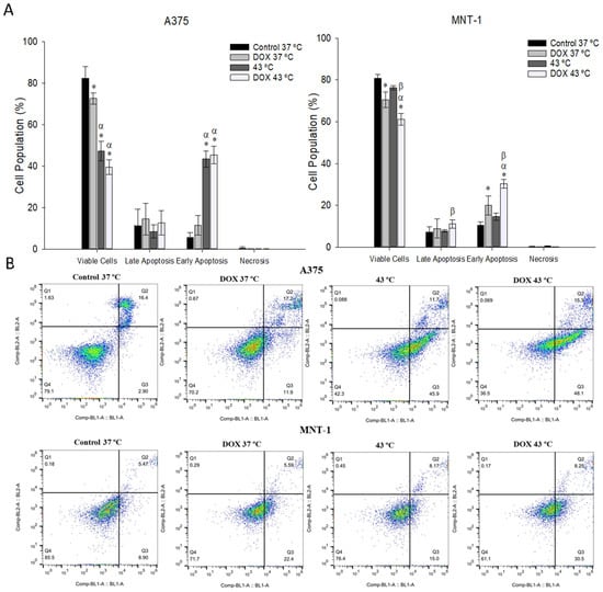 Effects of hyperthermia in combination with DOX on apoptotic profile. Both cell lines were exposed to 43 °C for 30 min and A375 cells were treated with 0.0125 μM and MNT-1 cells with 0.0179 μM of DOX for 48 h. (A) Percentage of apoptotic cells after treatment in populations corresponding to viable and non-apoptotic, early and late apoptotic A375 and MNT-1 cells; (B) histograms representative of Annexin V-FITC. Data shown are mean values ± standard deviation of two independent experiments with two technical replicates each and each replicate with at least 5000 events. *— indicates statistical significance in comparison to the control 37 °C; α indicates statistical significance in comparison to the respective control of each condition at 37 °C; and β indicates statistical significance of the combined treatment in comparison to hyperthermia alone (p < 0.05).