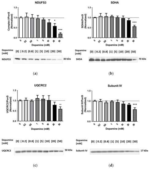 Effects of increasing doses of DA on the levels of subunit (a) NDUFS3 (complex I), (b) SDHA (complex II), (c) UQCRC2 (complex III), and (d) subunit IV (complex IV) in cytoplasm-suspended mitochondria. * p < 0.05, ** p < 0.01, *** p < 0.001, one-way ANOVA with Dunnett’s post hoc test.