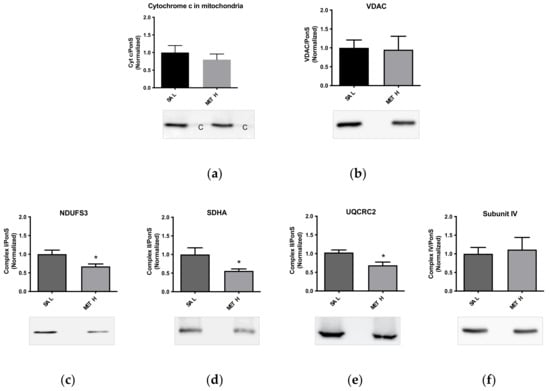 To determine the effects of METH alone on the immunoreactivities of striatal mitochondrial complexes suspended in the cytoplasm, the preparations were incubated with 10 µM METH for 30 min at 37 °C. A trend toward statistical significance for a decrease in the immunoreactivity of cytochrome c was detected in METH-treated mitochondria (p = 0.07) (Figure 3a). METH did not decrease the immunoreactivity of the voltage-dependent anion channel (VDAC), a multifunctional housekeeping mitochondrial protein in cytoplasm-suspended mitochondria (Figure 3b). However, METH decreased the levels of the complex I subunit NDUFS3 (−23%), complex II subunit SDHA (−44%), and complex III subunit UQCRC2 (−31%) (p < 0.05, Student’s t-test) in these mitochondrial preparations (Figure 3c–e). The immunoreactivity of the complex IV subunit (subunit IV) was not significantly decreased by METH (Figure 3f). Please see Figure A4 for supplementary data.