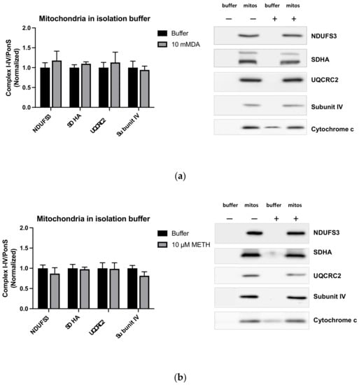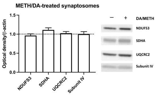 The striatal mitochondria assessed above compromised a mixture of synaptosomal, neuronal, and glial mitochondria, with synaptosomal mitochondria constituting a small percentage of the overall mitochondrial population. To determine whether the DA and METH combination alters the immunoreactivity of ETC complexes in striatal synaptosomes, cytoplasm- or buffer-suspended synaptosomal mitochondria were treated with saline or with 10 µM METH and 10 mM DA combination for 30 min at 37 °C. The DA/METH mix had no effect on any of the examined subunits, namely NDUFS3, SDHA, UQCRC2, or subunit IV of complexes I, II, III, and IV, respectively (Figure 6).