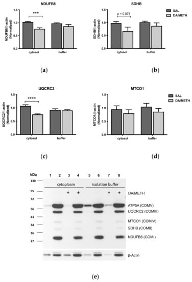 DA- or METH-induced ROS or RNS could have induced oxidative damage to multiple ETC subunits. To investigate whether other than already assessed ETC enzyme subunits are decreased by DA and/or METH, cytosol-suspended and isolation-buffer-suspended mitochondria were incubated with a mixture of 10 µM METH and 10 mM DA or saline for 30 min at 37 °C. The DA and METH combination caused a significant decrease in the immunoreactivity of the complex I subunit NDUFB8 (−28%, p < 0.001) complex III subunit UQCRC2 (−36%, p < 0.0001), and complex V subunit ATP5A (−26%, p < 0.01) (Student’s t-test) and produced a trend for statistical significance for a decrease in complex II subunit SDHB (−23%, p = 0.074) (Figure 5). In isolation-buffer-suspended mitochondria, the DA and METH mix did not significantly change the immunoreactivity of any of the subunits (Figure 5). These results suggest that multiple subunits ETC complexes are affected by DA and/or METH as early as 30 min after treatment and confirm that cytoplasmic components, such as degradation machinery, are necessary to observe deficits in the ETC complex subunits after exposure to DA or METH.