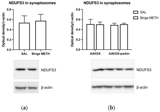 Parkin dysfunction, as well as complex I dysfunction, has been implicated in the pathogenesis of PD [22,23]. Loss of parkin activity has been reported to cause deficits in respiratory complexes, particularly in complex I [21]. To determine whether systemically administered binge METH decreases complex I NDUFS3 levels in striatal synaptosomes in vivo and whether this effect can be rescued by parkin overexpression, rats overexpressing parkin in the nigrostriatal DA pathway were treated with binge METH (4 × 10 mg/kg, i.p., every 2 h) or saline (1 mL/kg) and sacrificed 1 h after the last injection of the drug or saline. Striatal synaptosomes were isolated and assessed for NDUFS3 immunoreactivity. Noncoding adeno-associated viral 2/6 vector (AAV2/6 vector, a control for AAV2/6-parkin) had no statistically significant effect on NDUFS3 immunoreactivity. Binge METH had no statistically significant effect on NDUFS3 immunoreactivity either in wild-type rats or in rats microinjected with noncoding AAV2/6. Finally, parkin overexpression (~4–7-fold) had no effect on NDUFS3 immunoreactivity either in saline- or METH-treated rats 1 h after the treatment. The data are summarized in Figure 8.