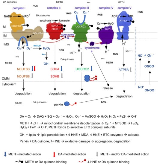 - DA and METH decrease activities of the ETC complexes via oxidative damage to their subunits.