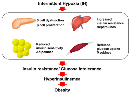 Taken together, there is accumulating evidence indicating that IH induces the impairment of glucose tolerance and insulin resistance in pancreatic β cells, hepatocytes, adipocytes, and skeletal muscle cells, which may contribute to obesity [82] (Figure 1).