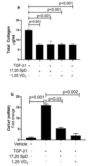 Fibroblasts were cultured and maintained in EMEM with 10% FCS, penicillin (100 units/mL), streptomycin (100 mg/mL), and 2 mM L-glutamine at 37 °C in a 5% CO2 humidified atmosphere. Fibroblasts between 10 and 16 passages were used for the experiments. Prior to the experiments, the fibroblast medium was changed to EMEM supplemented with 10% charcoal (Sigma-Aldrich, St. Louis, MO, USA)-stripped fetal calf serum (Atlanta Biologics, Flowery Branch, GA, USA) for 72 h. After a 72 h incubation period, the medium was changed to 1% charcoal-stripped FCS for 24 h. Following the 24 h incubation period, fibroblasts were incubated with 17,20S(OH)2pD or 1,25(OH)2D3 at either 10−8 M or 10−9 M or ethanol (ETOH) vehicle at 1:10,000 or 1:1 million dilution to control for final ETOH concentration in the 10−8 M and 10−9 M 17,20S(OH)2pD and 1,25(OH)2D3 preparations in culture. Fibroblasts were allowed to incubate under these conditions for a 2 h period before stimulation with TGF-β1 (R&D Systems, Minneapolis, Minnesota USA) dissolved in 0.1% bovine serum albumin (BSA) in 4 mM hydrochloric acid (Gibco, Life Technologies, Waltham MO, USA) to a final concentration of 5 ng/mL or BSA/HCL diluted 1:2000 to control for the final BSA-HCL in TGF-β1 concentration. Fibroblasts were cultured under these conditions either for an additional 24 h for total RNA extraction and 48 h for the analysis of total collagen or protein synthesis, respectively.