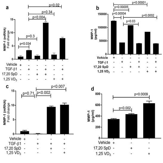 Excess tissue matrix accumulation in systemic sclerosis (SSc) contributes to fibrosis. It has been suggested that decreased serum levels of matrix metalloproteinases (MMPs) may aggravate this matrix overload. Normal and SSc fibroblasts were cultured with 17,20S(OH)2pD to determine the effect on MMP-1. While TGF-β1 slightly increased MMP-1 mRNA and protein expression in normal fibroblasts, the addition of 17,20S(OH)2pD to TGF-β increased MMP-1 RNA expression even more (Figure 2a). Normal fibroblasts were not affected by either 17,20S(OH)2pD or 1,25(OH)2D3 (Figure 2b). When we examined SSc fibroblasts, we found that dermal fibroblasts had active TGF-β signaling and spontaneously produced more collagen than cultured fibroblasts from healthy donors [,,]. In SSc fibroblasts, the addition of 17,20S(OH)2pD or 1,25(OH)2D3 increased gene expression and protein synthesis of MMP-1 (Figure 2c,d). These data suggest that both 17,20S(OH)2pD and 1,25(OH)2D3 potentially can alleviate fibrosis by increasing MMP-1.
