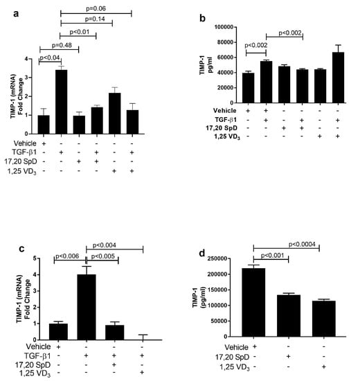 Elevated levels of tissue inhibitors of matrix metalloproteinases (TIMPs) may contribute to matrix accumulation in systemic sclerosis (SSc). In normal fibroblasts, TGF-β1 increased the expression of TIMP-1 mRNA and protein. 1,25(OH)2D3 in the presence of TGF-β1 suppressed TIMP-1 mRNA expression and 17,20S(OH)2pD and in the presence of TGF-β1 inhibited protein synthesis of TIMP-1 in normal fibroblasts (Figure 3a,b). In SSc fibroblasts, although basal TIMP-1 mRNA and protein levels were increased, 17,20S(OH)2pD and 1,25(OH)2D3 significantly decreased TIMP-1 protein and mRNA expression in SSc fibroblast lines (Figure 3c,d). These results suggested that 17,20S(OH)2pD has anti-fibrogenic properties including the inhibition of collagen synthesis by stimulation of MMP-1 mRNA and protein production and suppression of TIMP-1 protein production in both normal and SSc fibroblasts.