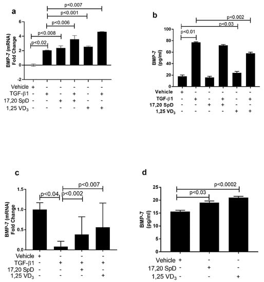 TGFβ-1 is a potent stimulator of collagen synthesis by fibroblasts. On the other hand, even in the presence of TGF-β1, bone morphemic protein (BMP-7) can inhibit CI synthesis and the resulting matrix accumulation. Normal and SSc dermal fibroblasts were cultured with 17,20S(OH)2pD to examine its effect on BMP-7, PGES, and PAI-1 expression. Although BMP-7 mRNA expression was slightly increased in TGF-β1-stimulated normal fibroblasts, 17,20S(OH)2pD either alone or co-cultured with TGF-β1 further increased BMP-7 mRNA expression. BMP-7 expression was also increased with 1,25(OH)2D3 alone and in the presence of TGF-β1. Protein levels were not affected by 17,20S(OH)2pD in normal fibroblasts (Figure 4a,b). On the other hand, SSc fibroblasts had decreased basal expression of BMP-7, so that the addition of 17,20S(OH)2pD significantly increased the expression of BMP-7. A similar increase was seen when fibroblasts were cultured with 1,25(OH)2D3 (Figure 4c,d). These data suggest that in both normal and SSc fibroblasts, 17,20S(OH)2pD either alone or in the presence of TGF-β1 can increase BMP-7 expression, helping alleviate excessive fibrosis.