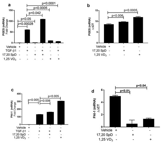 17,20S(OH)2pD increases PGES and inhibits PAI-1 mRNA expression in normal and SSc dermal fibroblasts. Normal (Panels (a,c)) and SSc (Panels (b,d)) dermal fibroblast were treated with either 17,20S(OH)2pD 10−8 M, 1,25(OH)2D3 10−8 M, or vehicle (EMEM + 1% stripped FCS + 0.1% BSA with 4 mM HCL (vehicle for TGF-β1) + ETOH (1:10,000 or 1:1 million (vehicle for 17,20S(OH)2pD and 1,25(OH)2D3)), followed by stimulation with TGF-β1 5 ng/mL for 24 h and then analyzed for PGES or PAI-1 mRNA expression (fold change). p < 0.05 is significant.