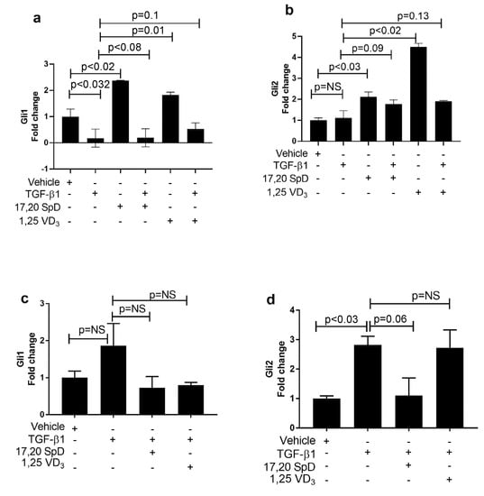 17,20S(OH)2pD had no effect on GLi mRNA expression in SSc dermal fibroblasts, but in the presence of TGF-β1 increases Gli2 expression in normal fibroblast. Normal (Panels (a,b)) and SSc (Panels (c,d)) dermal fibroblast were treated with either 17,20S(OH)2pD 10−8 M, 1,25(OH)2D3 10−8 M, or vehicle (EMEM + 1% stripped FCS + 0.1% BSA with 4 mM HCL (vehicle for TGF-β1) + ETOH (1:10,000 or 1:1 million (vehicle for 17,20S(OH)2pD and 1,25(OH)2D3)), followed by stimulation with TGF-β1 5 ng/mL for 24 h and then analyzed for Gli1 or Gli2 mRNA expression (fold change). NS is not significant. p < 0.05 is significant.
