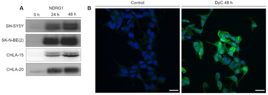To determine NDRG1′s subcellular localization and validate the change in its expression in response to DpC treatment, immunofluorescence analysis was performed in SH-SY5Y neuroblastoma cells. The results were in accordance with the Western blot analysis, and highly upregulated expression of NDRG1 was observed in DpC-treated SH-SY5Y cells that exhibited both cytoplasmic and nuclear patterns of NDRG1 signal (Figure 1B).